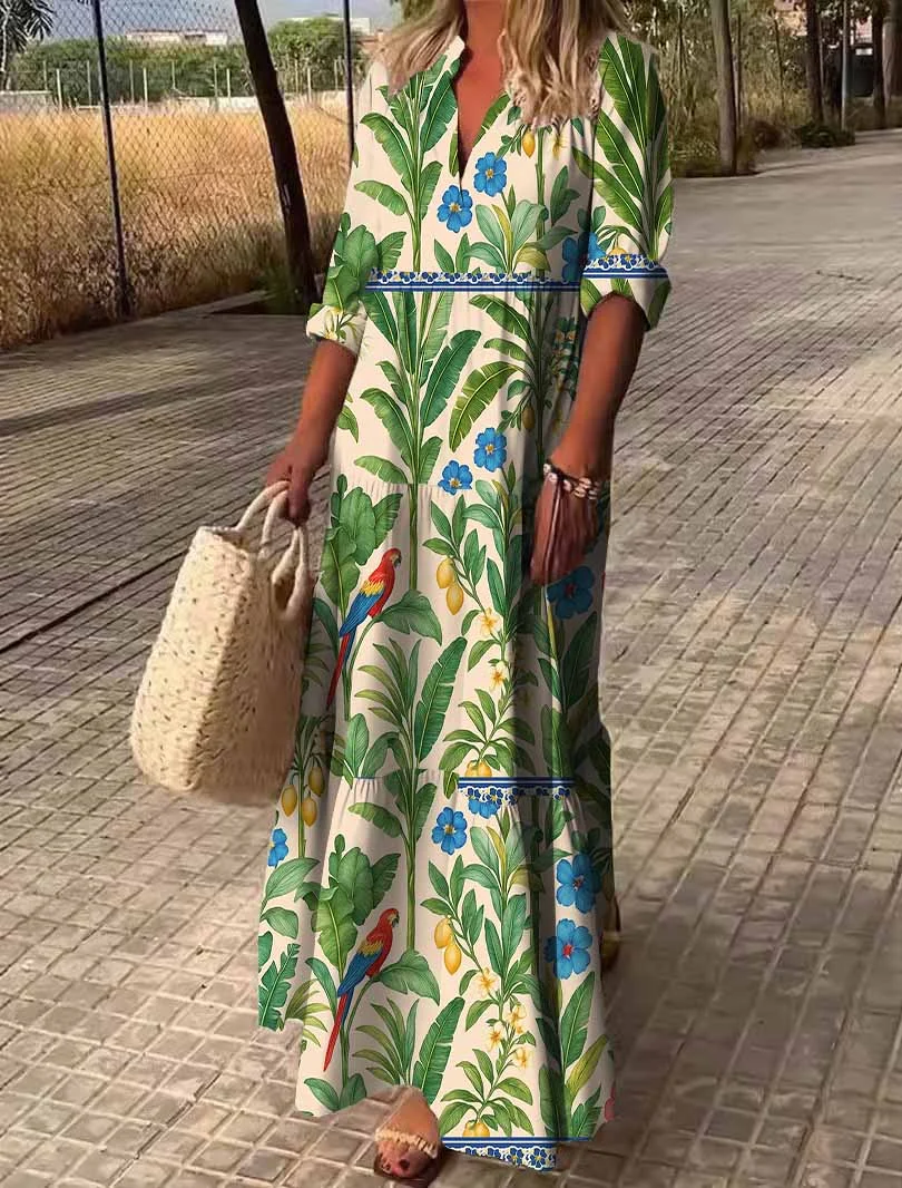 Women Tropical, Green DZDN0087 SPU Printed Long Sleeve V-neck Maxi Dress