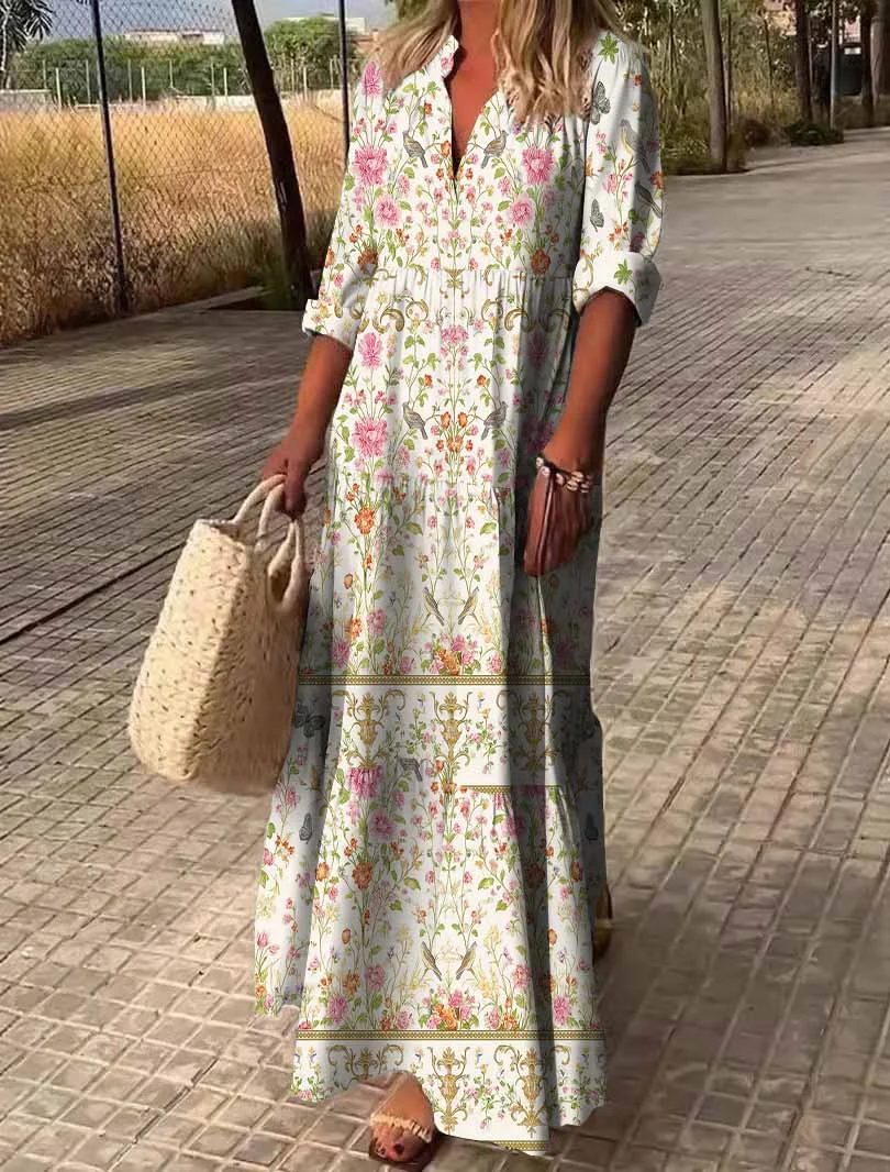 Women Floral, Pink, Green DZDN0181 SPU Printed Long Sleeve V-neck Maxi Dress