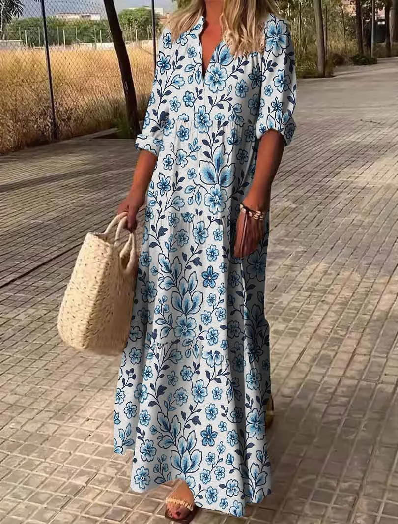 Women Floral,Blue,Black DZDN0267 SPU Printed Long Sleeve V-neck Maxi Dress