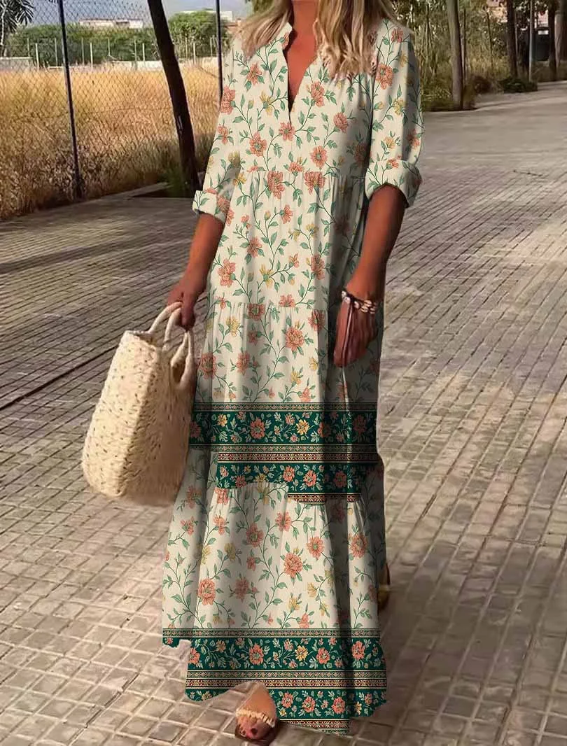 Women Bohemian,Red,Green,Floral DZDN0283 SPU Printed Long Sleeve V-neck Maxi Dress
