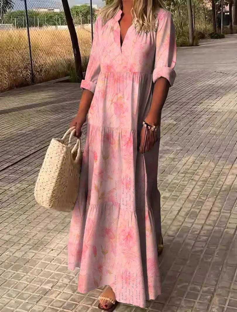 Women Pink, Flowers DZDN0462 SPU Printed Long Sleeve V-neck Maxi Dress