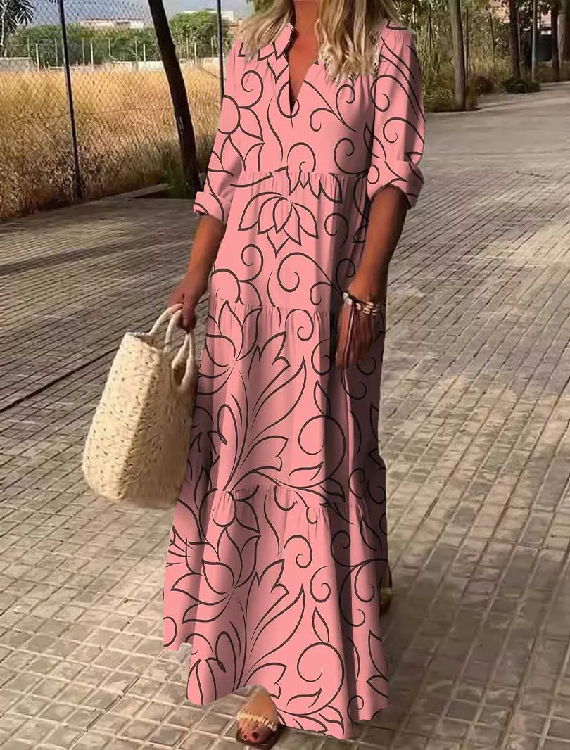 Women Geometric, Pink, Black DZDN0647 SPU Printed Long Sleeve V-neck Maxi Dress