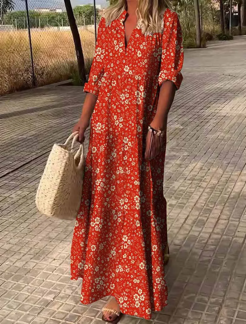 Women Floral, Red DZDN0802 SPU Printed Long Sleeve V-neck Maxi Dress