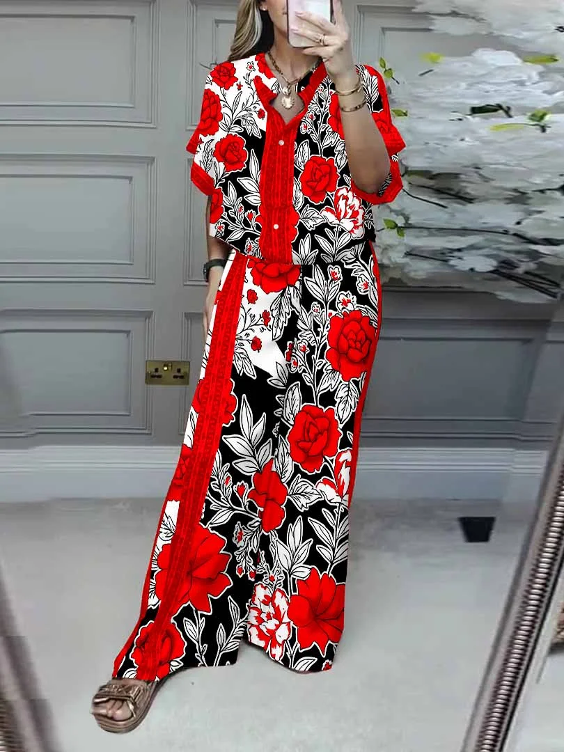 Women Floral,Red,Black DZDL1182 V-neck Short Sleeve Blouse and Pants Set